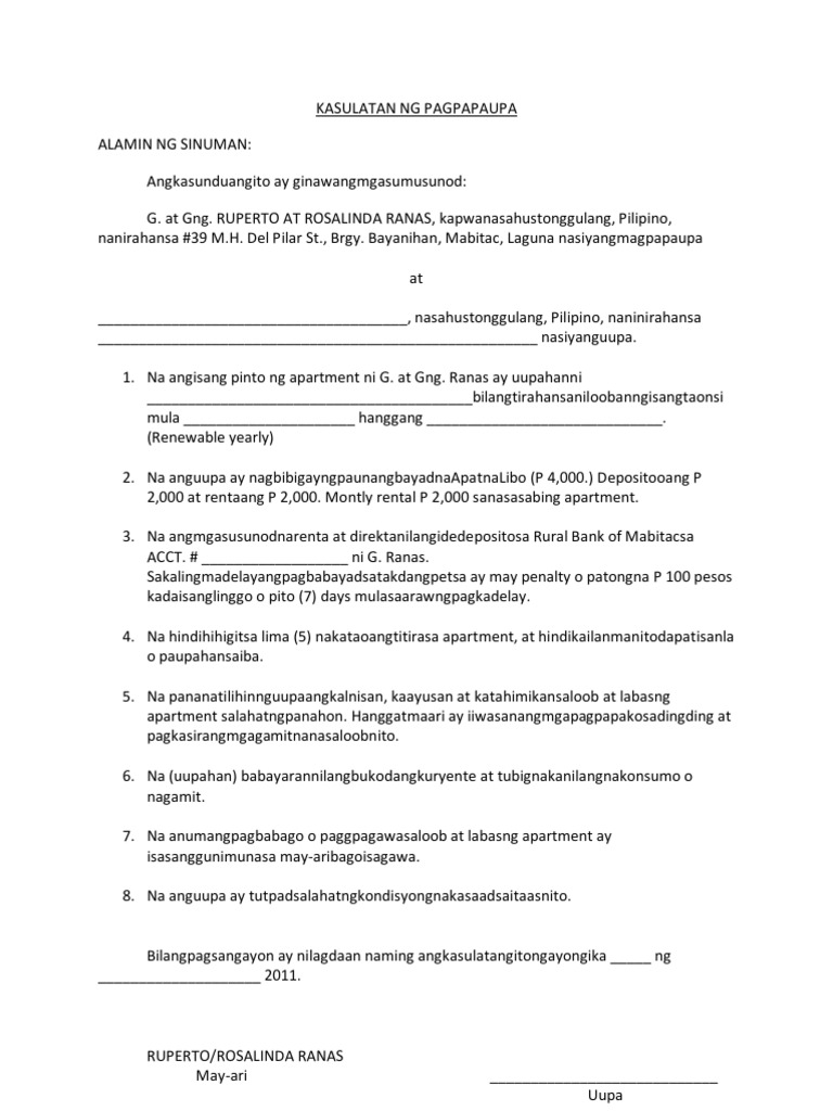 Kasunduan sa pagpapaupa sa mga kinauukulan nito, ang kasunduang ito ay ginawa at nilagdaan ng na ang nagpapaupa at ang uupa o umuupa ay nagkasundo na uupahan at papaupahan ang nasabing bahay sa ilalim ng patakaran at alituntunin na gaya ng mga sumusunod. Ang kasunduang ito ay ginawa at nilagdaan ng dalawang paning ngayong _ ng _, 20____, dito sa tamaraw hills, valenzuela city, nina g. Contextual translation of memorandum ng kasunduan format sample. Mahalagang tanungin mo rin ang iyong sarili. Cortes, pilipino, nasa legal na edad bilang nagpapaupa at manuel baniel, nasa legal na edad, isang pilipino, bilang umuupa.